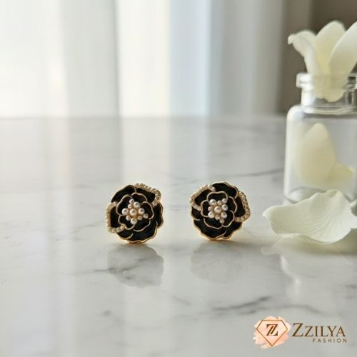 Channel classic luxury with our striking Black Enamel & Pearl Camellia Flower Stud Earrings. Inspired by iconic fashion houses, these studs feature intricate black enamel petals accented with delicate faux pearls at the center and edges, creating a bold yet sophisticated floral statement. They are the perfect accessory to add high-fashion elegance to any evening or professional look.