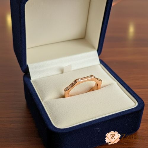 Embrace subtle sophistication with this handcrafted rose gold band. Designed for the modern romantic, it features brilliant-cut diamonds seamlessly set into a smooth, polished finish. Whether worn as a wedding band, a stacker, or a standalone statement, its minimalist charm makes it a versatile addition to any jewelry collection.”