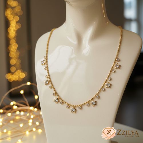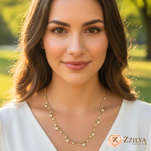 Elevate your look with the ZZILYA celestial necklace. Dainty gold stars and crystals meet a premium anti-tarnish finish. Perfect for layering or making a solo statement. Effortless, waterproof luxury.