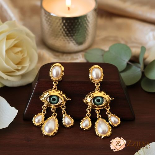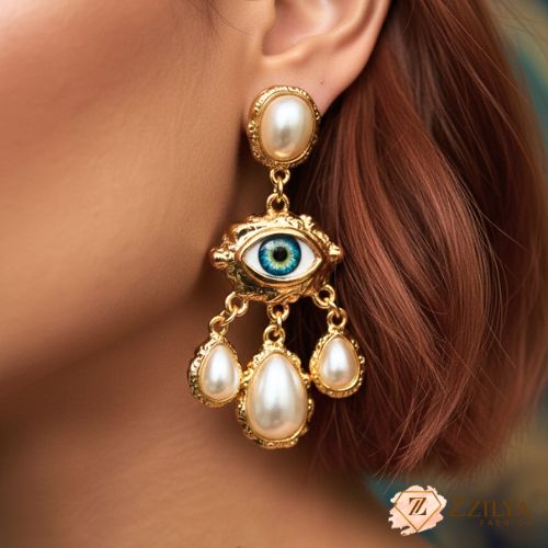 Make a statement with ZZILYA’s mystical chandelier earrings. Combining symbolic evil eye charms with elegant pearl droplets, these 100% anti-tarnish earrings bring a touch of luxury and protection to any look.